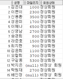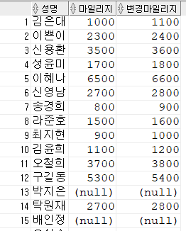 -- ALIAS : 회원ID, 회원명, 마일리지, 변경마일리지