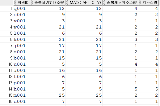 , MAX(DISTINCT CART_QTY) AS 중복제거최대수량