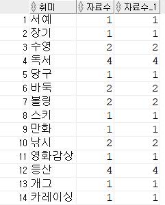 -- ALIAS는 취미, 자료수, 자료수(*)