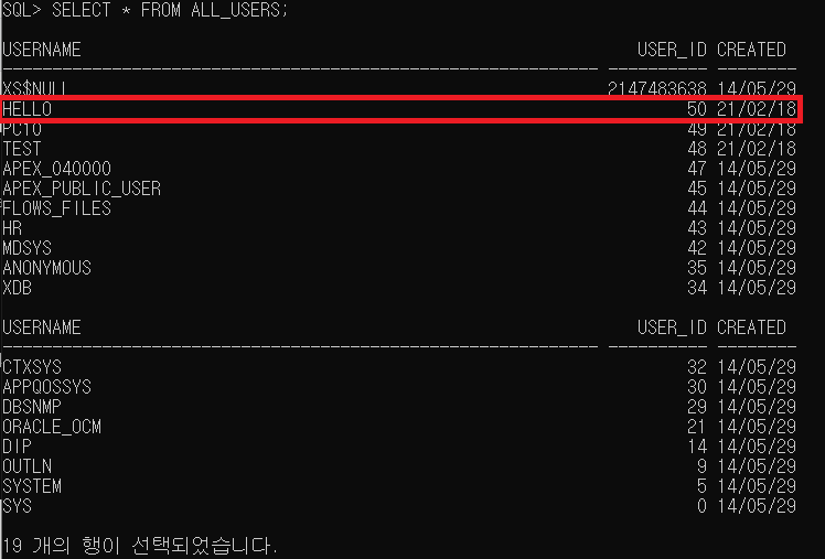HELLO 라는 사용자가 추가되었는지 확인하기 위해 다음 코드를 실행합니다.