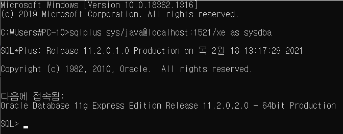 위 화면과 같이 접속되었다면 오라클 서버에 접속을 성공한 것입니다.